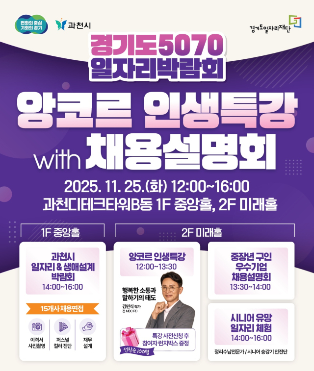 경기도는 경기도일자리재단, 과천시와 공동으로 25일 과천디테크타워에서 ‘2025 과천시 일자리&생애설계박람회’와 ‘경기도 5070 일자리박람회 with 앙코르 인생특강·채용설명회’를 연계 개최한다고 17일 밝혔다.